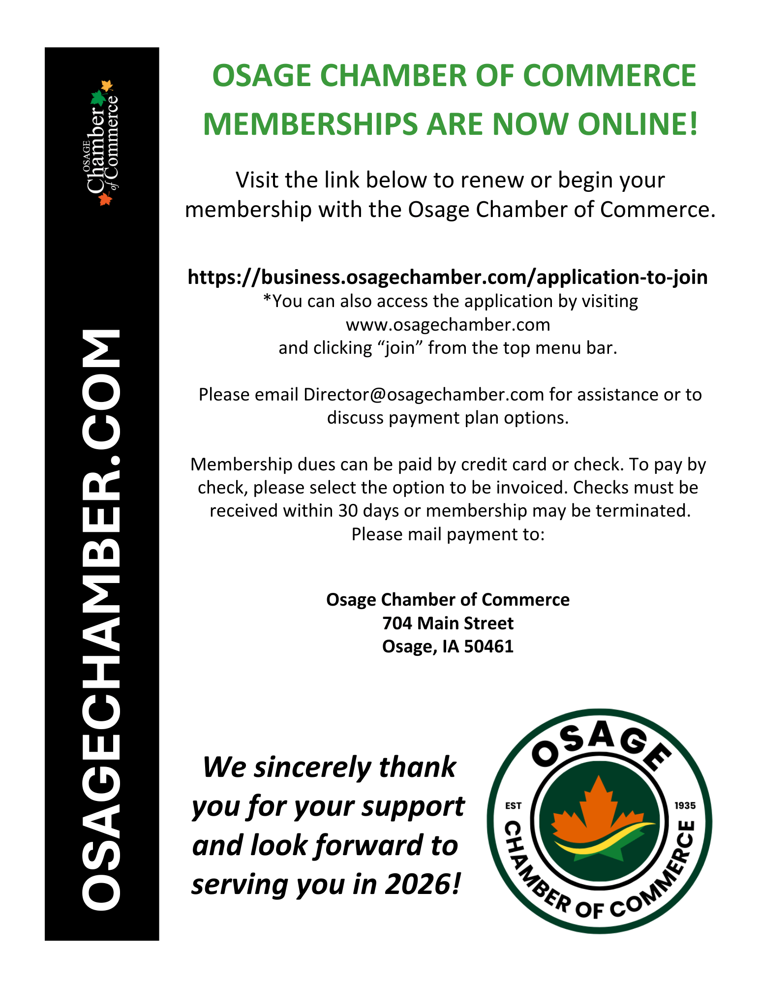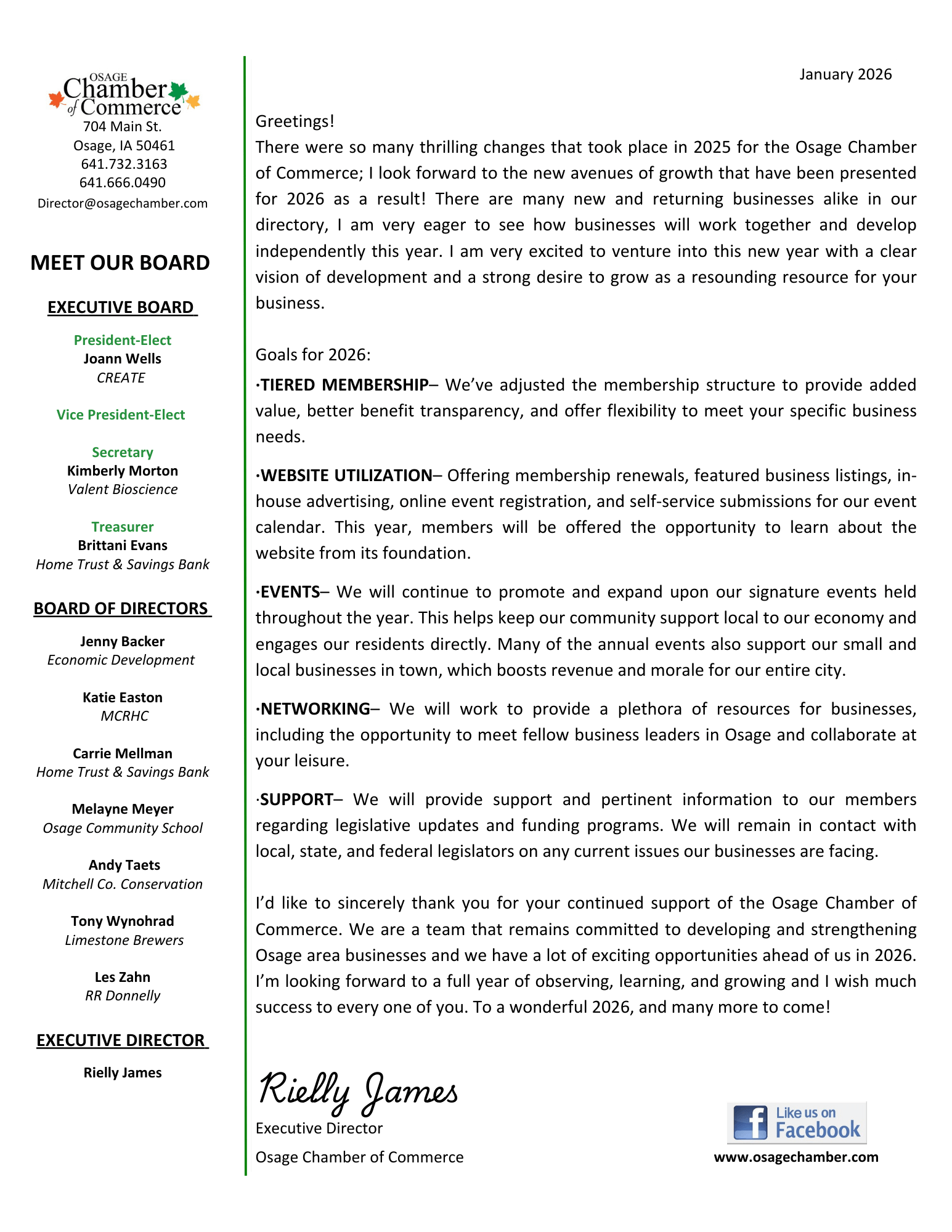 I’d like to sincerely thank you for your continued support of the Osage Chamber of Commerce. We are a team that remains committed to developing and strengthening Osage area businesses and we have a lot of exciting opportunities ahead of us in 2026. I’m looking forward to a full year of observing, learning, and growing and I wish much success to every one of you. To a wonderful 2026, and many more to come!